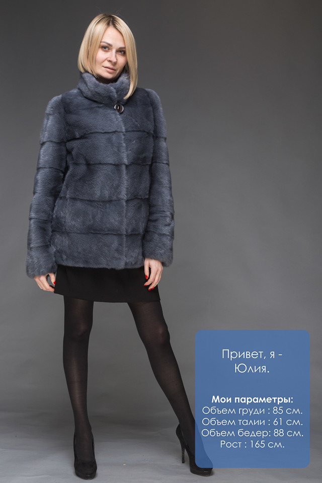 Норкова шуба поперечного крою з коміром-стійкою в кольорі джинс. Скандинавська норка з густим подушком, є доступ до шкур.
